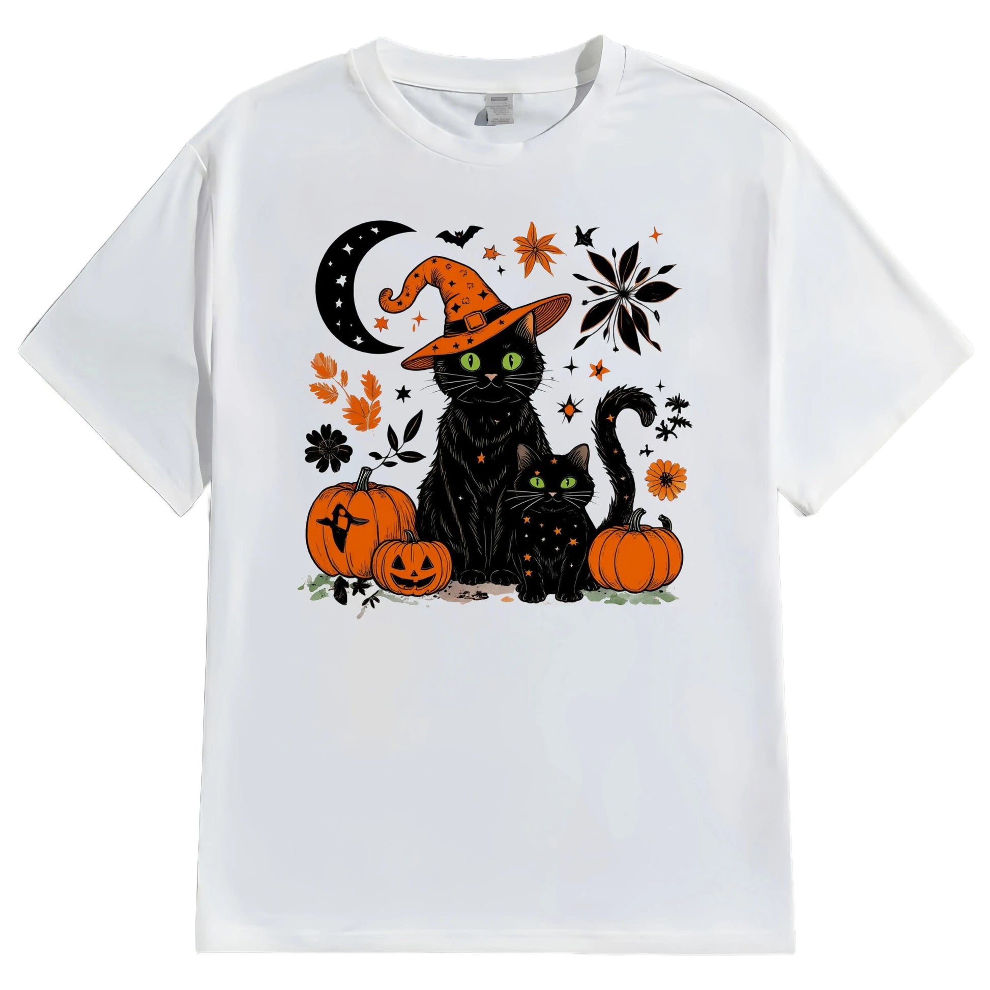 Halloween Casual Round Neck Short Sleeve T-Shirt Regular Fit Cat and Pumpkin Print Comfortable Men's Top Fashion Streetwear