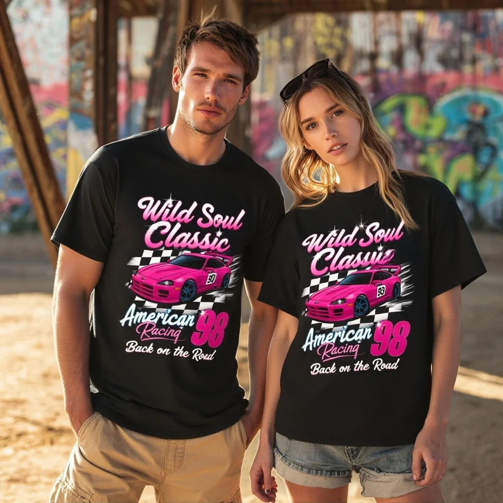 Men's and Women's T Shirts | Wild Soul Classic Car Printed Tee | American Racing 99 Back on the Road Casual Tops for Daily Wear | Trendy Graphic Tee 2025