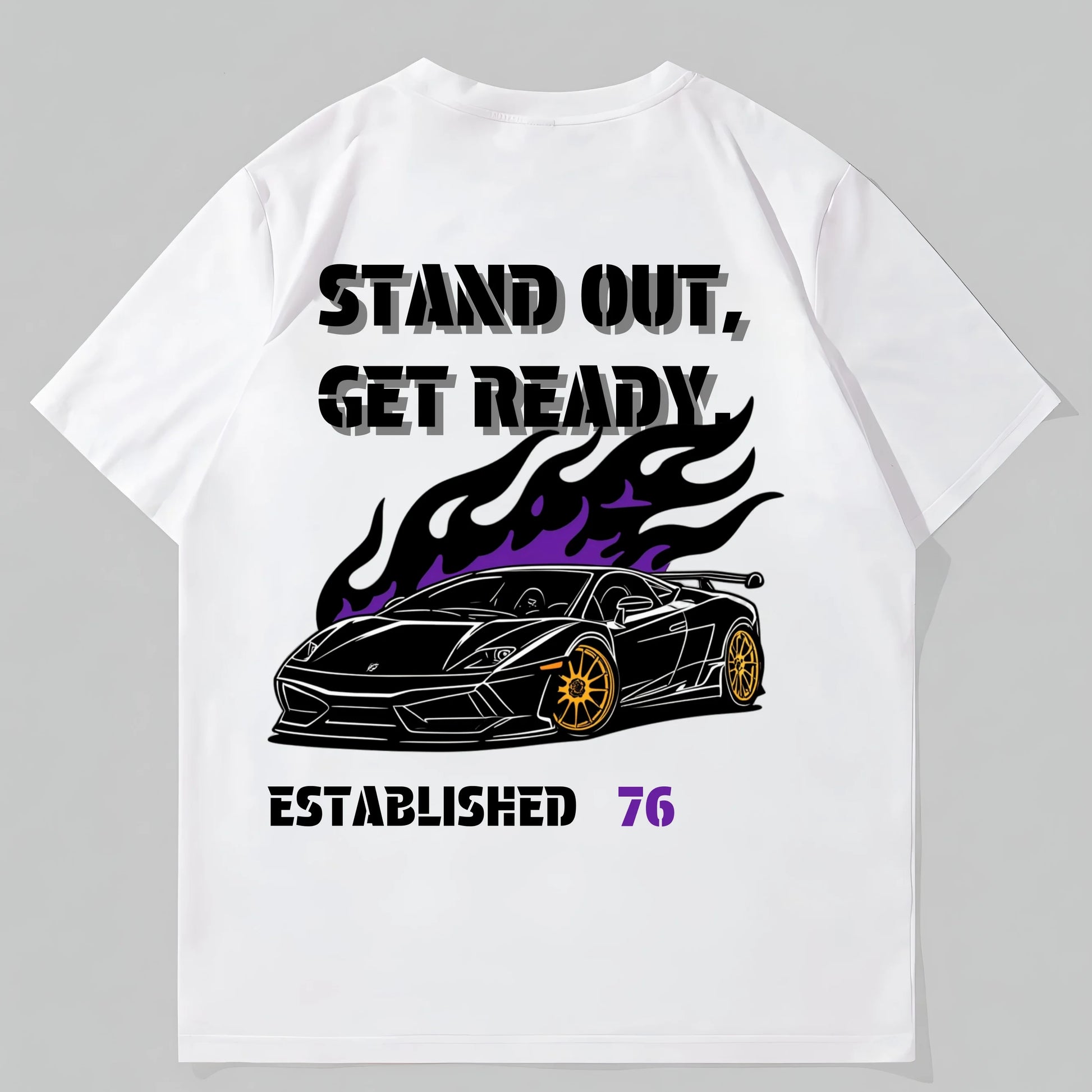 Trendy Tees For Men White T-Shirt with Flame Car Graphic and Text Stand Out, Get Ready for Casual Wear