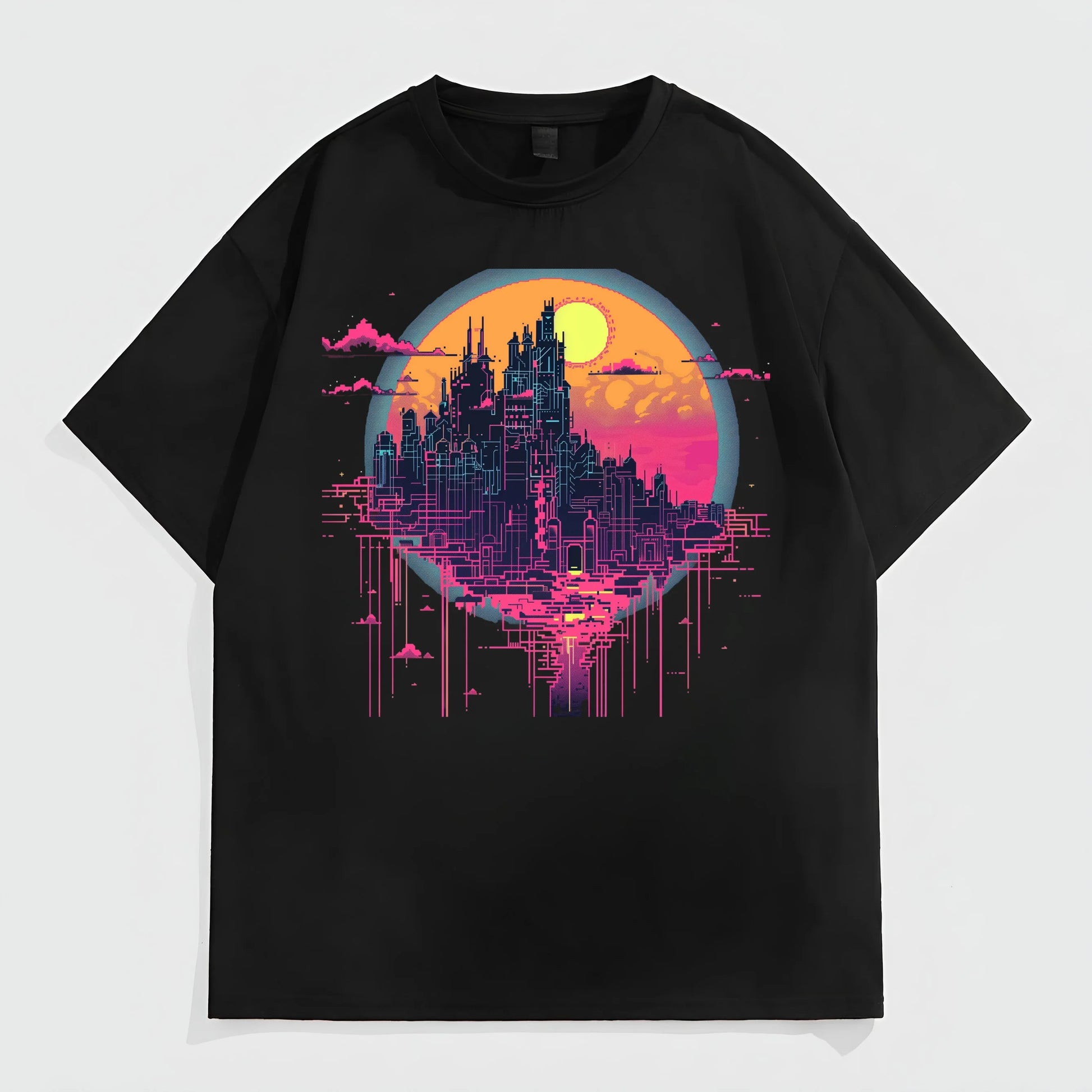 Black Oversized T-Shirt with Futuristic Castle Sunset Print for Casual Wear Fashion Tees For Summer