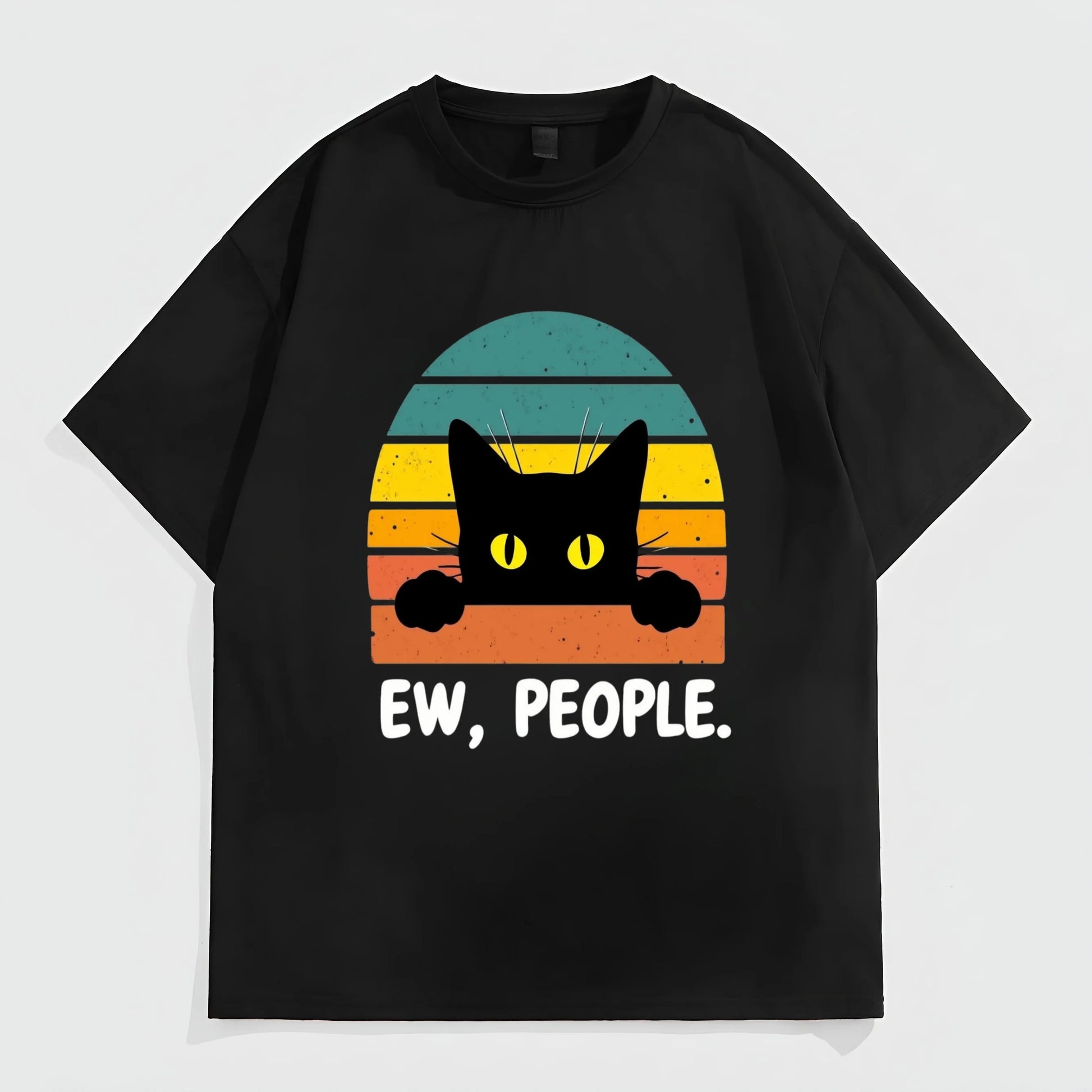 Black Short Sleeve T-Shirt with Cat and Sunset Print Ew, People - Casual Daily Wear for Men Women Graphic Tees Design
