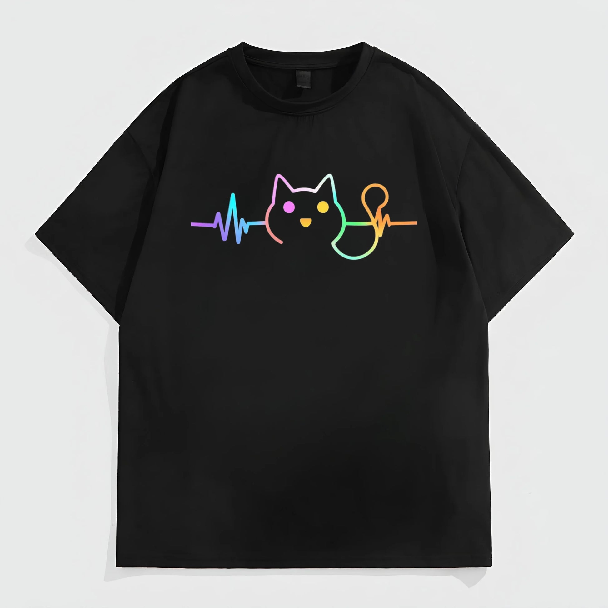 Black Short Sleeve T-Shirt with Colorful Cat Heartbeat Design for Casual Wear Fashion Tees For Summer