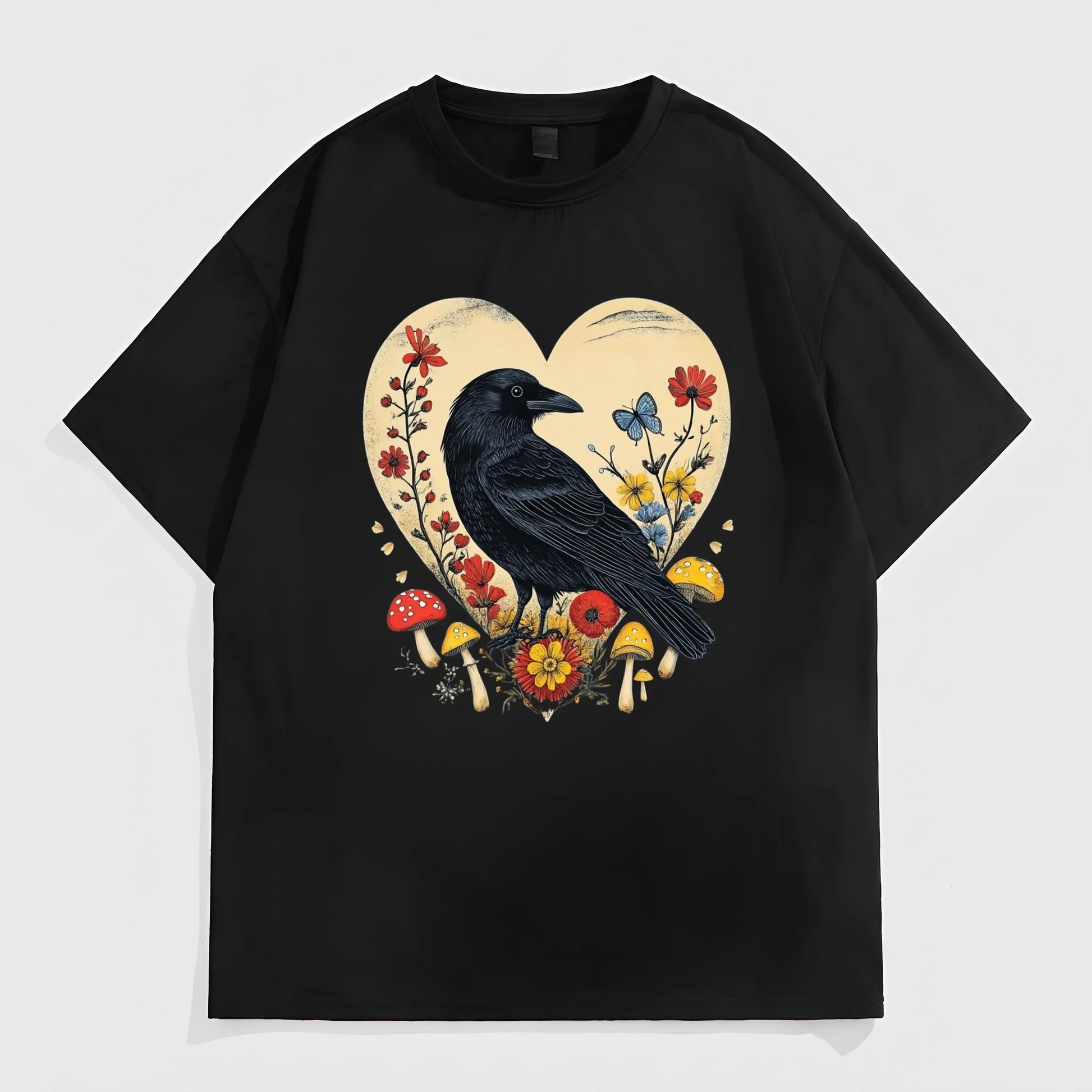 Black Short Sleeve T-Shirt with Heart and Crow Floral Print for Casual Wear Fashion Tees For Summer