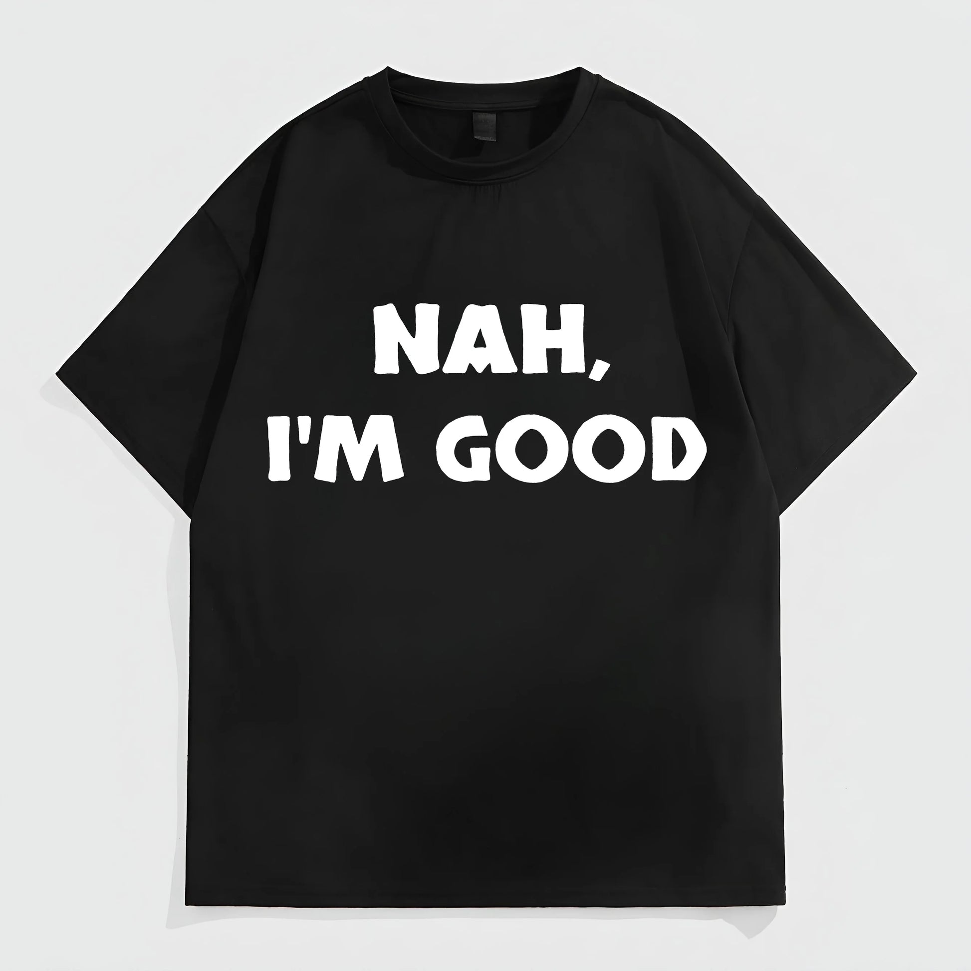 Black Short Sleeve T-Shirt with NAH, I'M GOOD Print for Casual Wear Graphic Tees Outfit