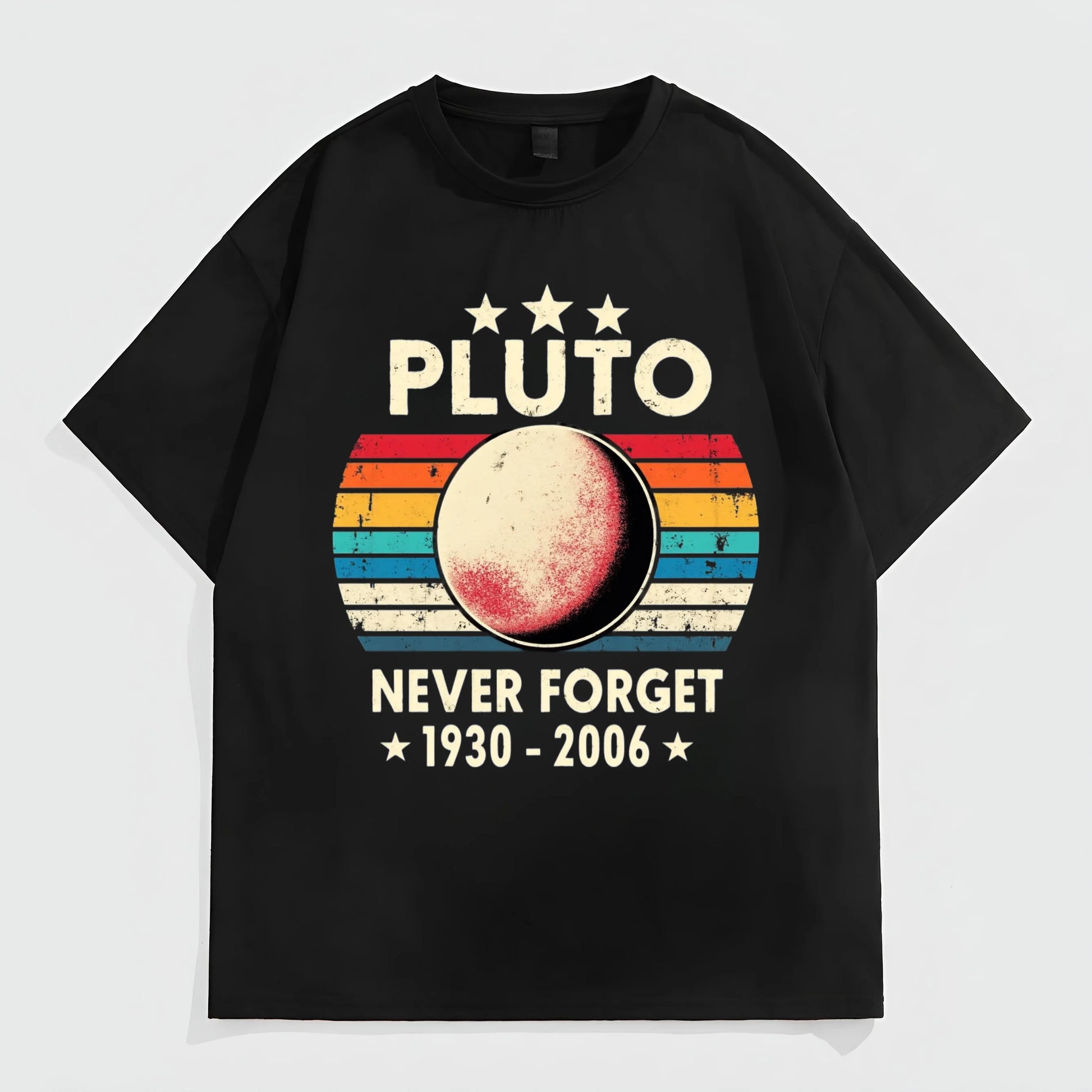 Black Short Sleeve T-Shirt with Pluto Planet Retro Print and Never Forget 1930-2006 Text for Casual Wear Trendy Tees Trends