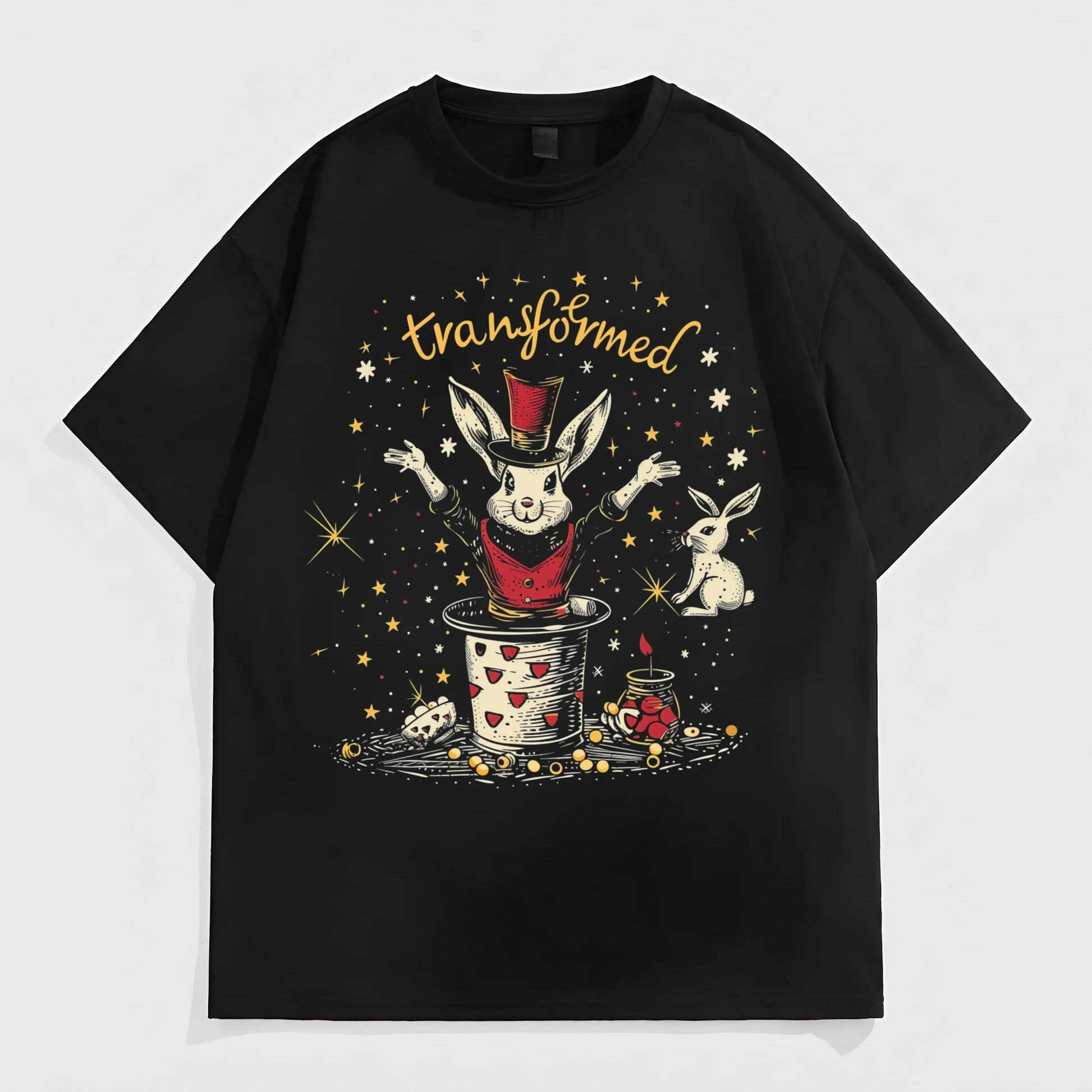 Black Short Sleeve T-Shirt with Rabbit and Hat Print for Casual Wear Fashion Tees For Summer