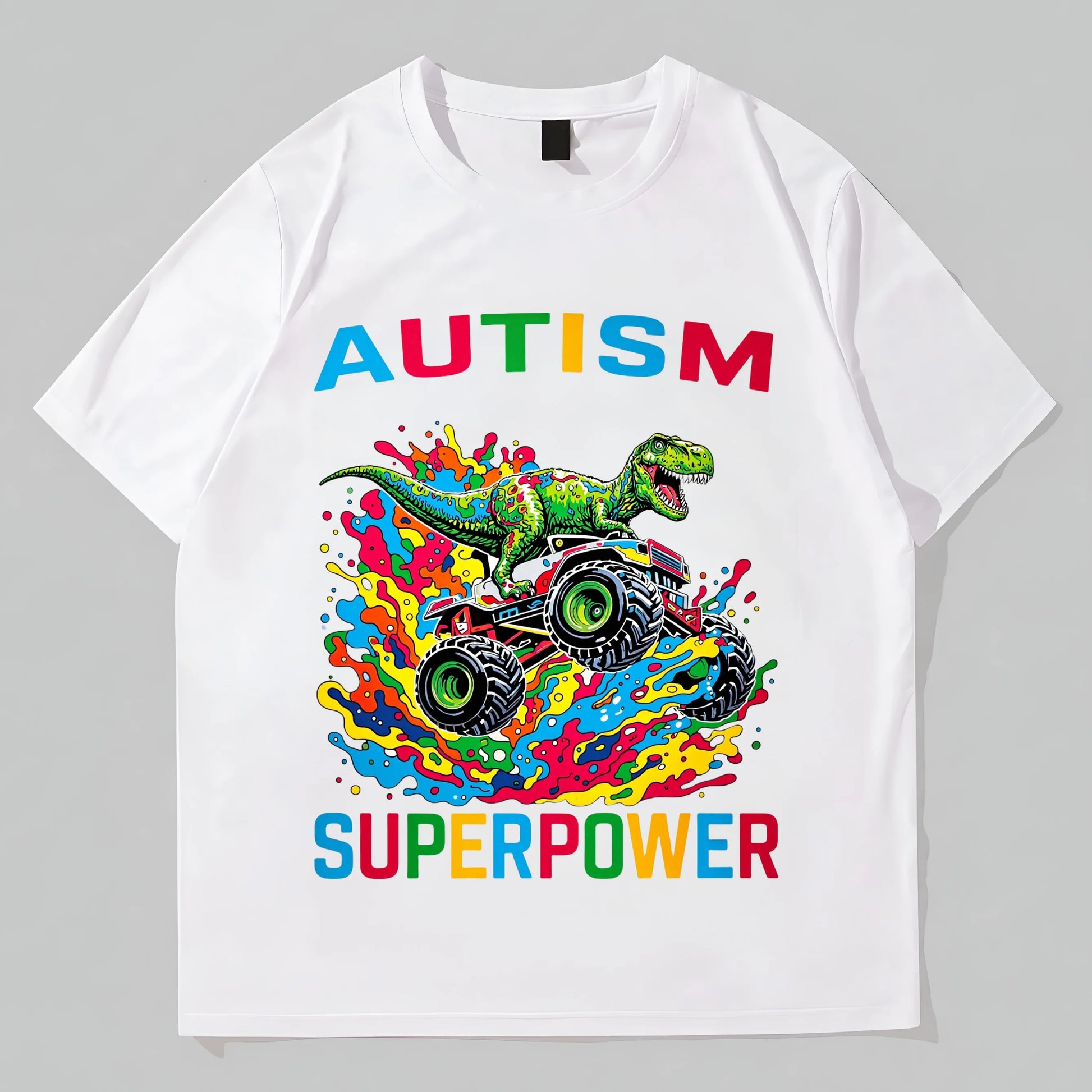 Colorful Dinosaur Monster Truck Print T-Shirt Autism Superpower Text Design for Kids Casual Wear Fashion Tees For Summer