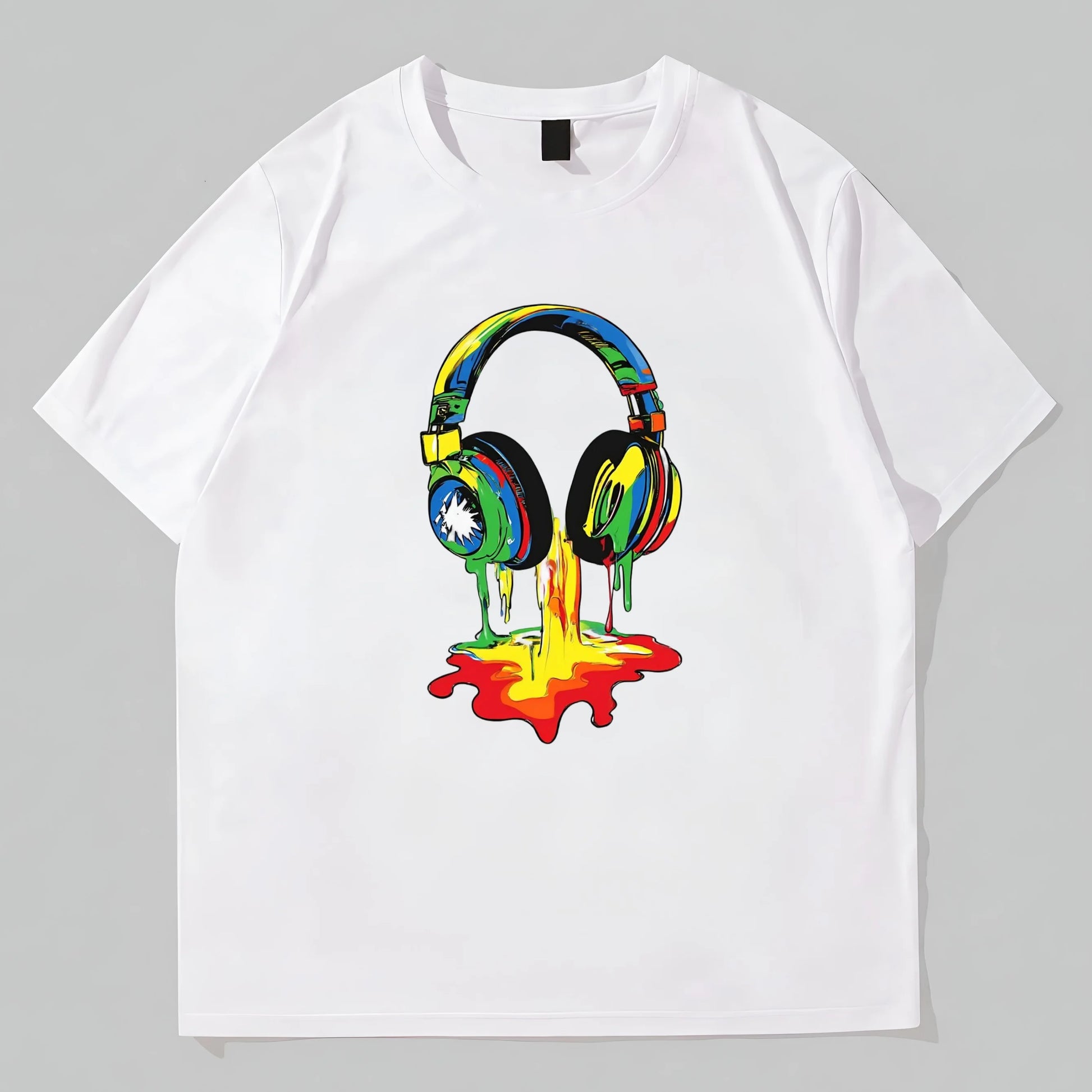 Colorful Headphone Design White T-Shirt Rainbow Paint Drip Art Print Casual Wear Men Women Daily Streetwear Fashion Top POD Graphic Tees