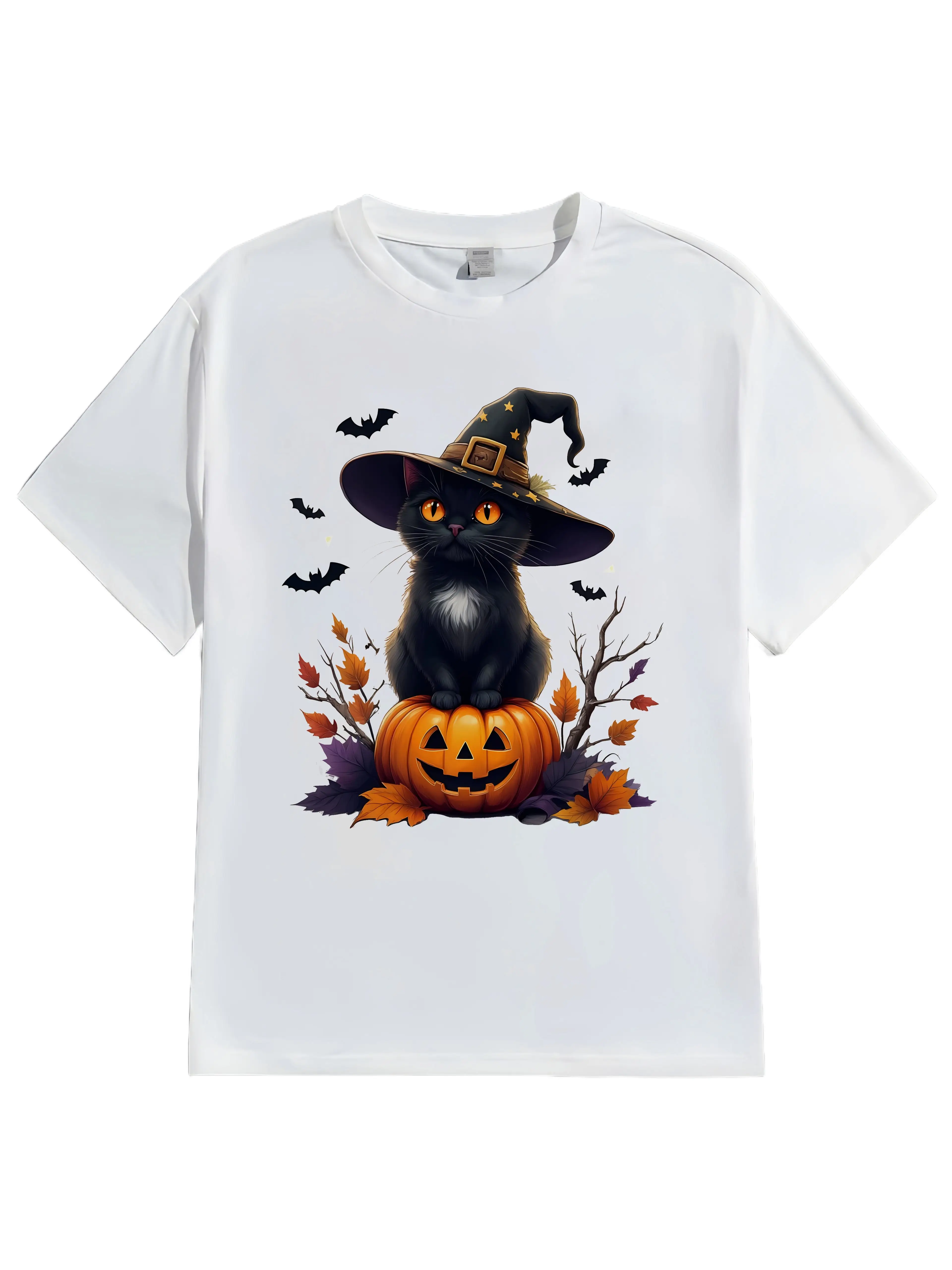 Crew Neck T Shirt Halloween Cat Pumpkin Bat Print Casual Wear for Festive Party Fashionable Graphic Tee for Men