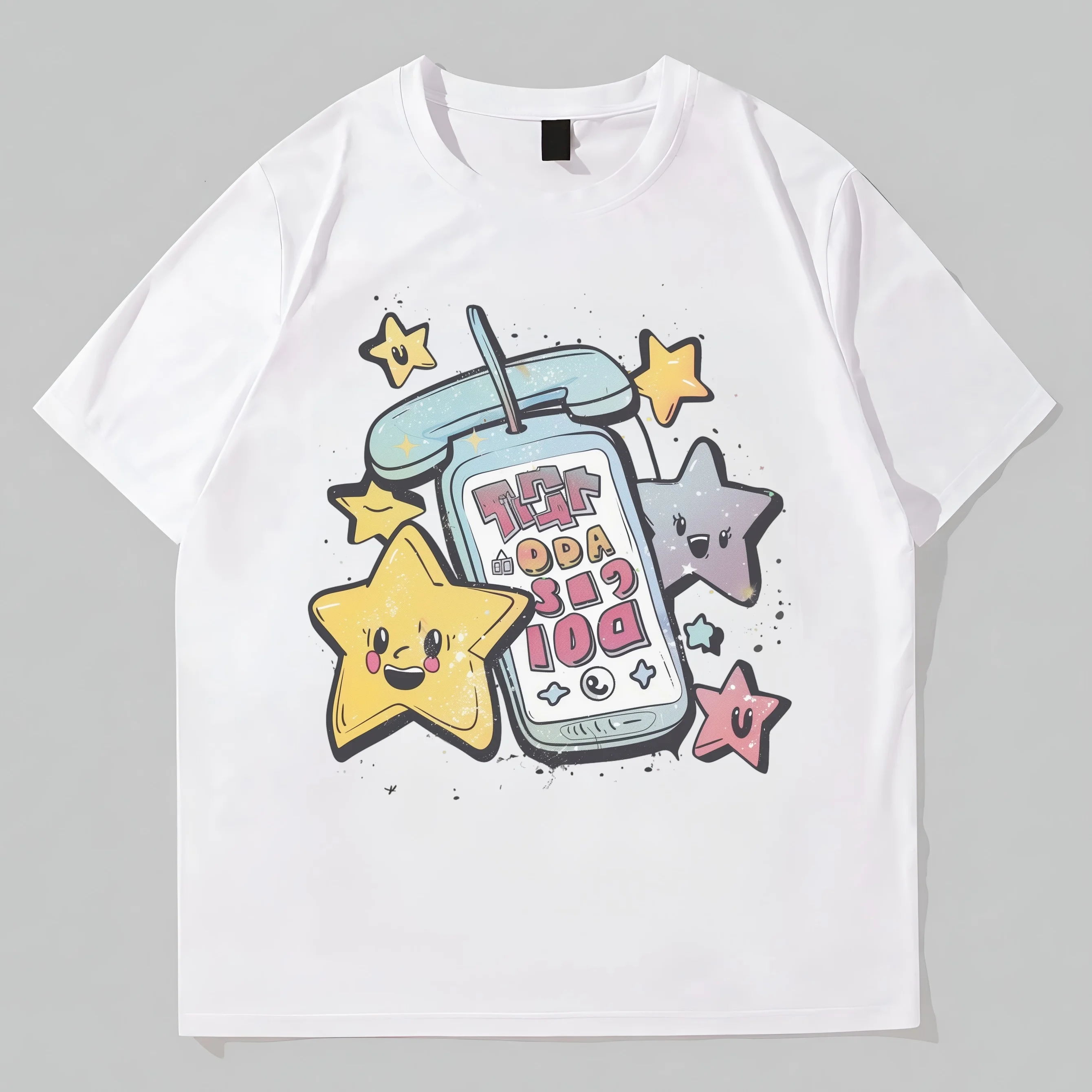 Cute Round Neck T-Shirt with Star and Drink Cup Print for Casual Wear Graphic Tees Design