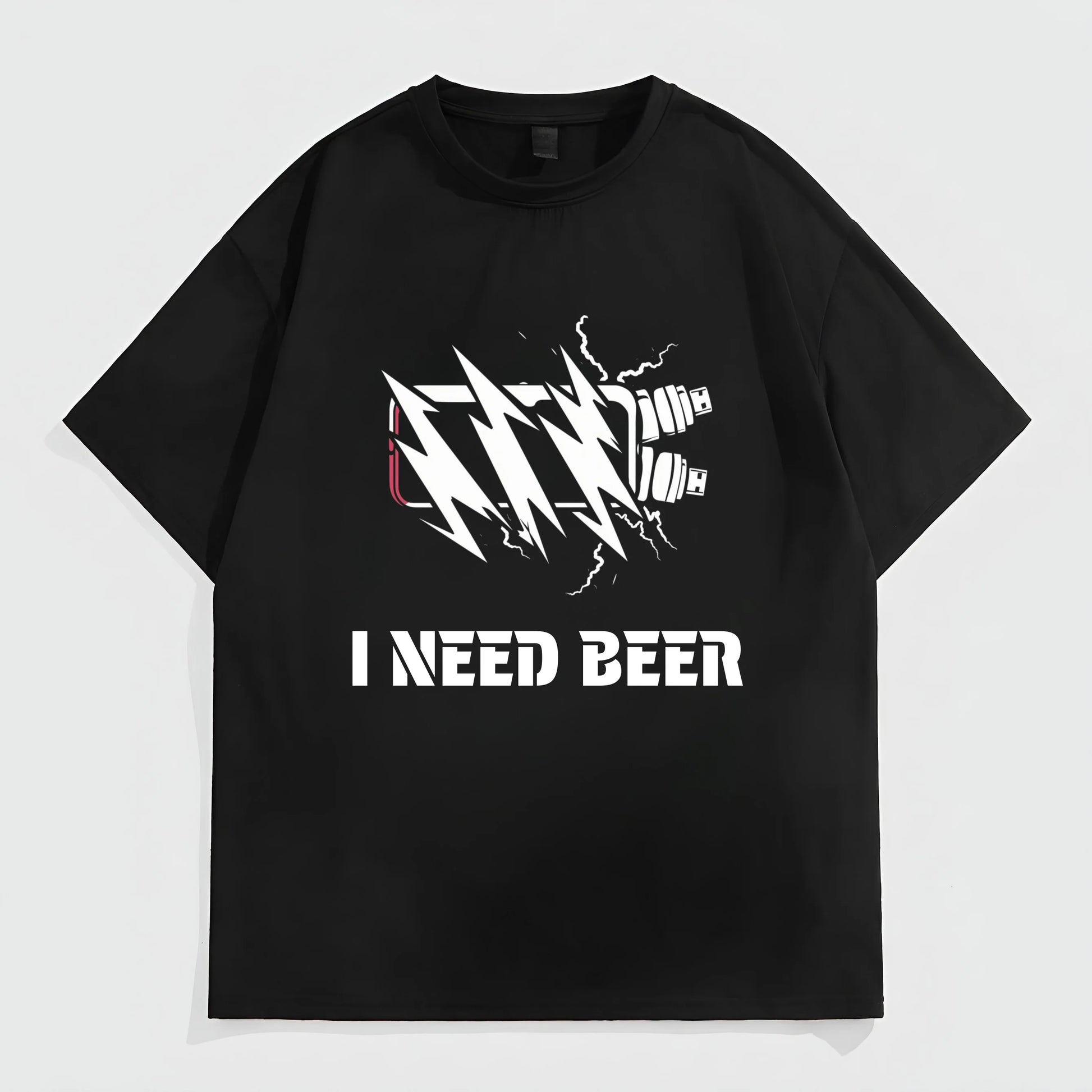 Fashion Tees for Summer Men's Casual T-Shirt Lightning Bolt Design I NEED BEER Print for Party and Daily Wear