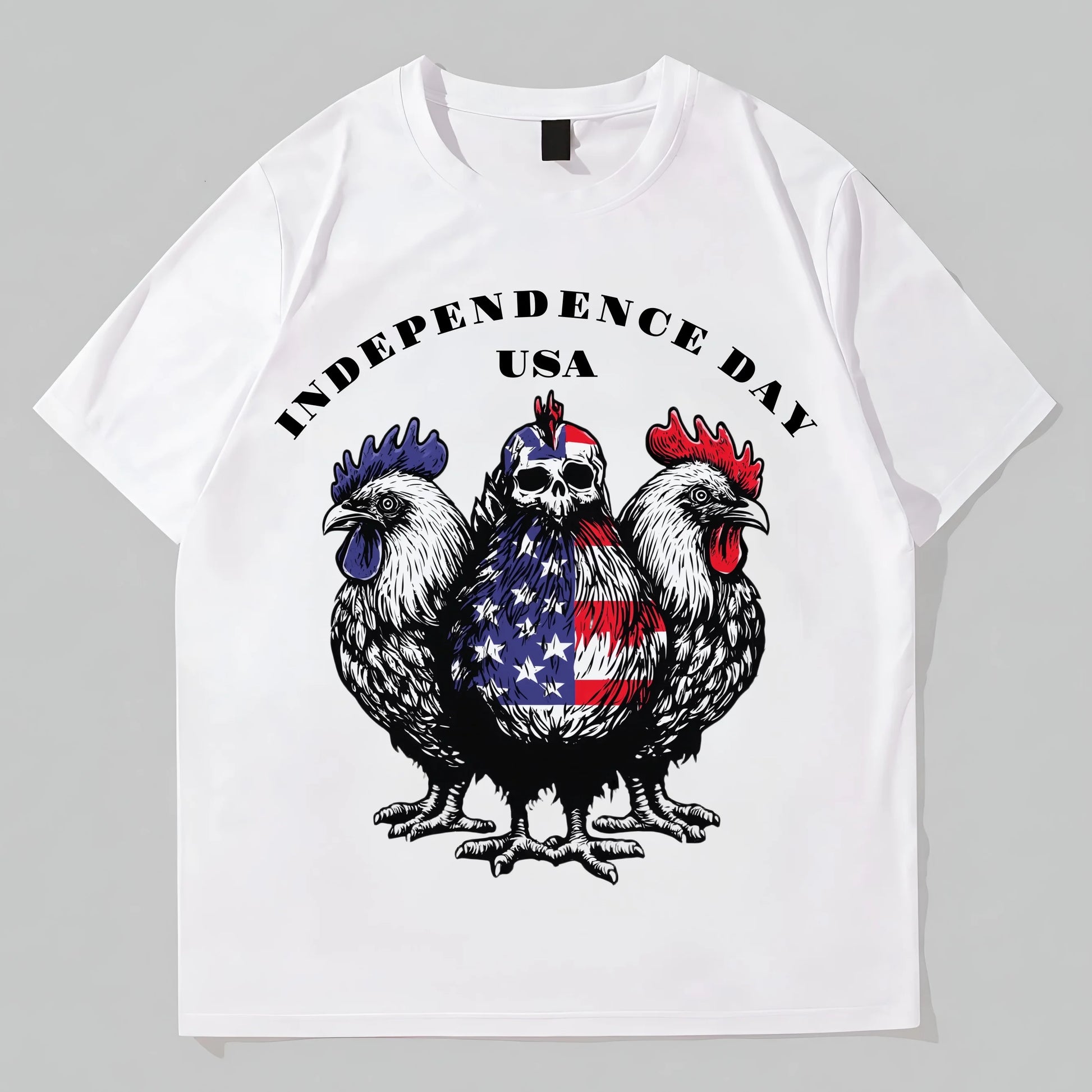 Fashion Tees For Summer White T-Shirt with Rooster and Flag Print for Independence Day Celebrations