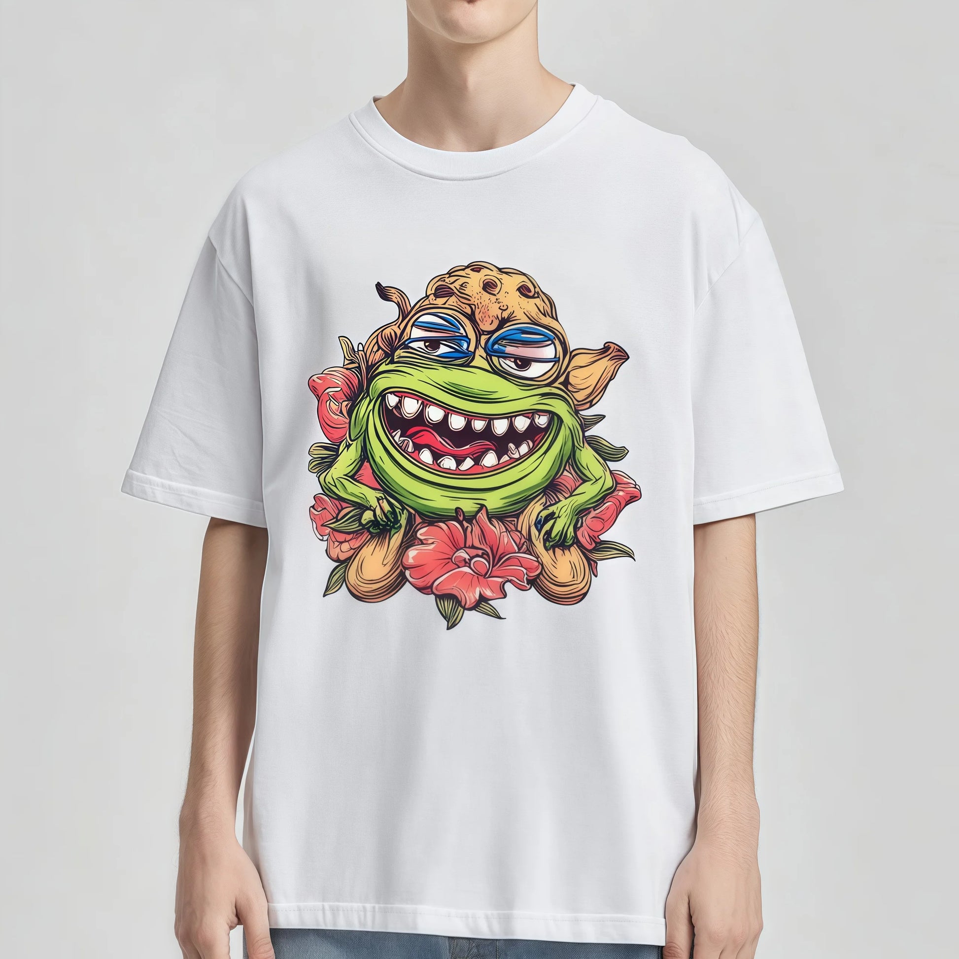 Graphic Fashion Tees For Man White T-Shirt with Cartoon Monster and Flowers Print for Casual Wear