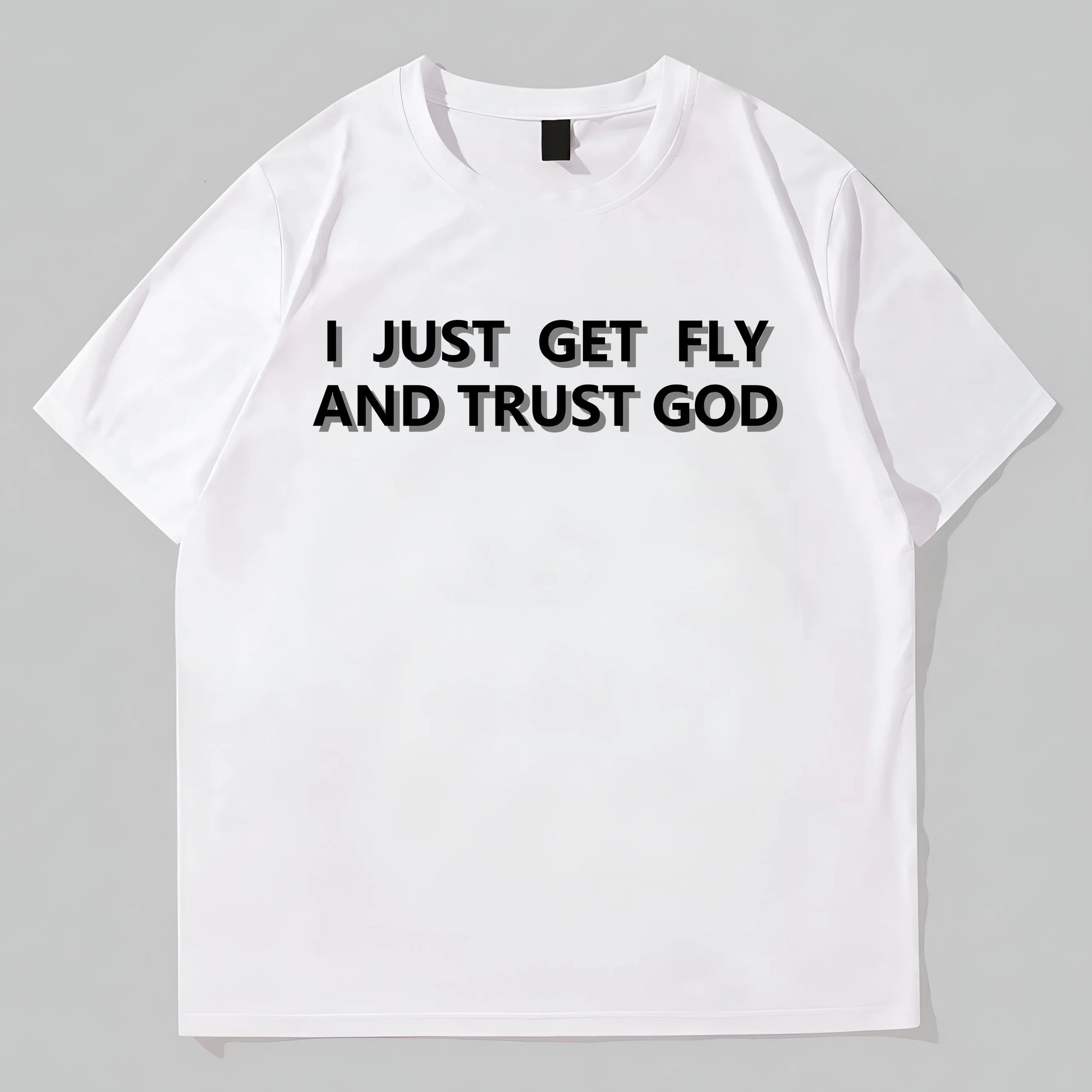 Graphic Tees Design Simple Round Neck T-Shirt with Inspirational Quote I JUST GET FLY AND TRUST GOD for Casual Wear