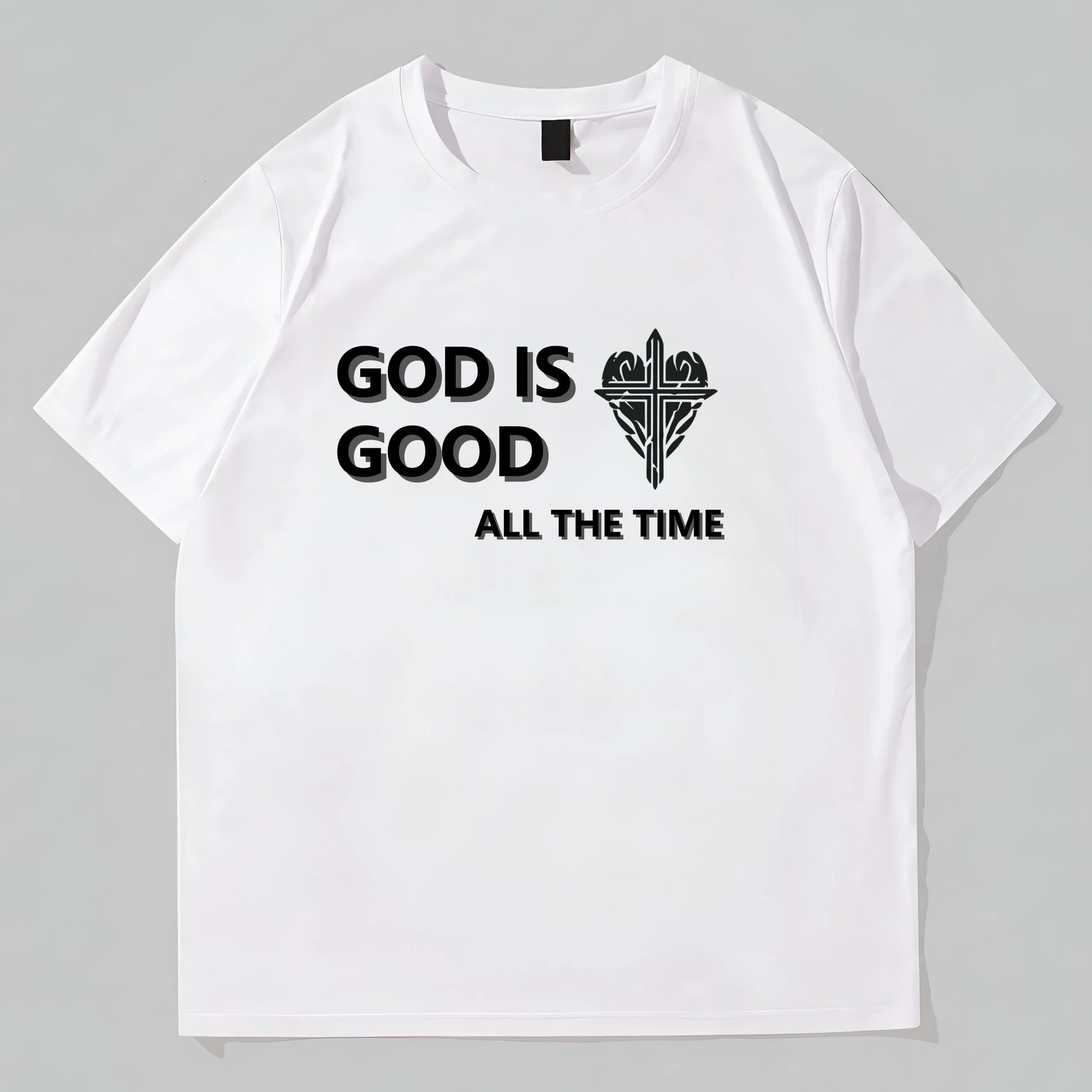 Graphic Tees Design White Round Neck T-Shirt with God is Good All the Time Text and Heart Design for Casual Wear