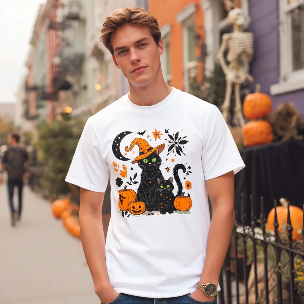 Halloween T Shirt Black Cat Pumpkin Moon Print Casual Tee for Party Festival Decorations Men's Cotton Top Autumn Wear Fashionable Graphic Tee for Men