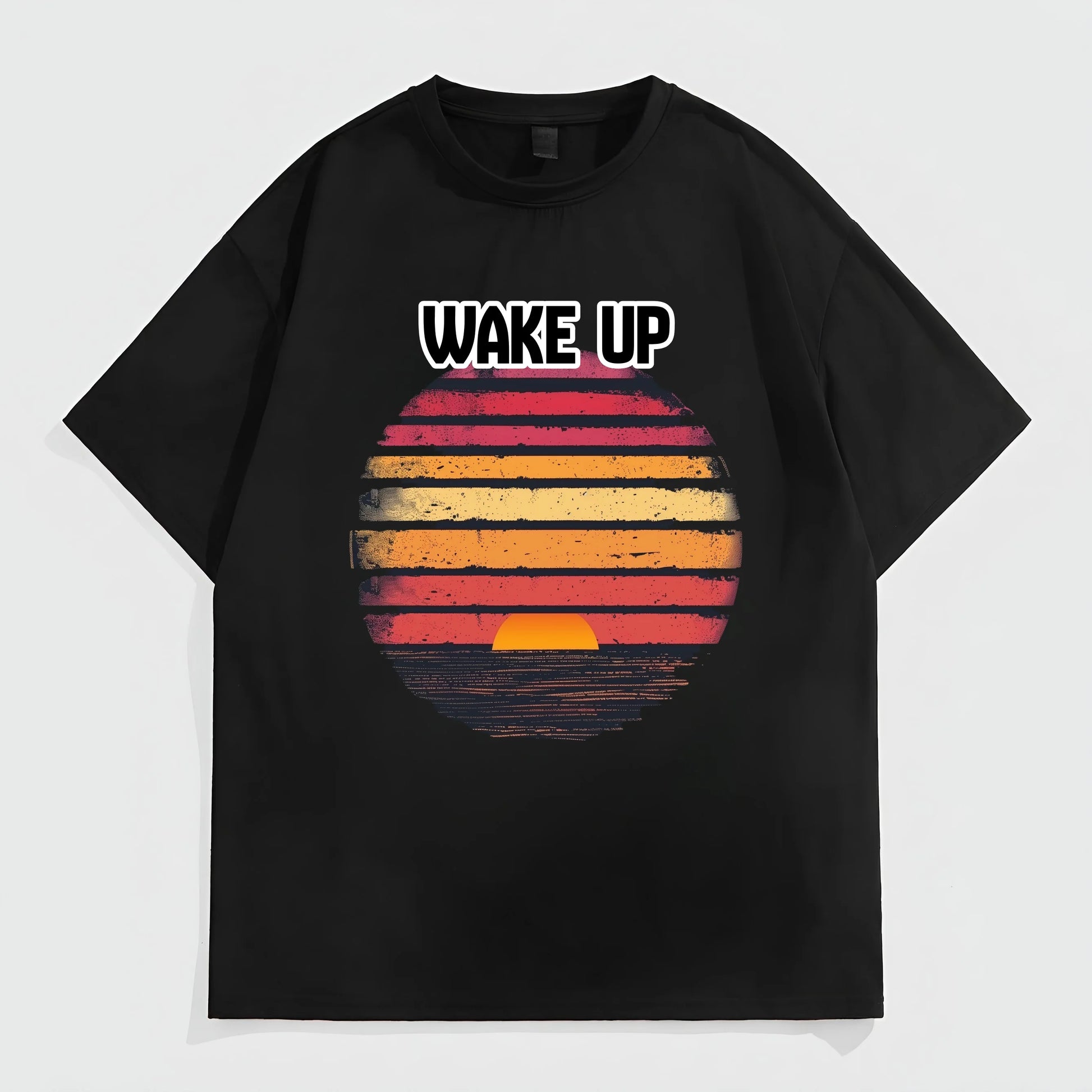 Men's Casual T-Shirt Retro Sunset Stripes Print WAKE UP Text Design for Daily Wear Outdoor Activities Summer Fashion Top Trendy Tees For Men