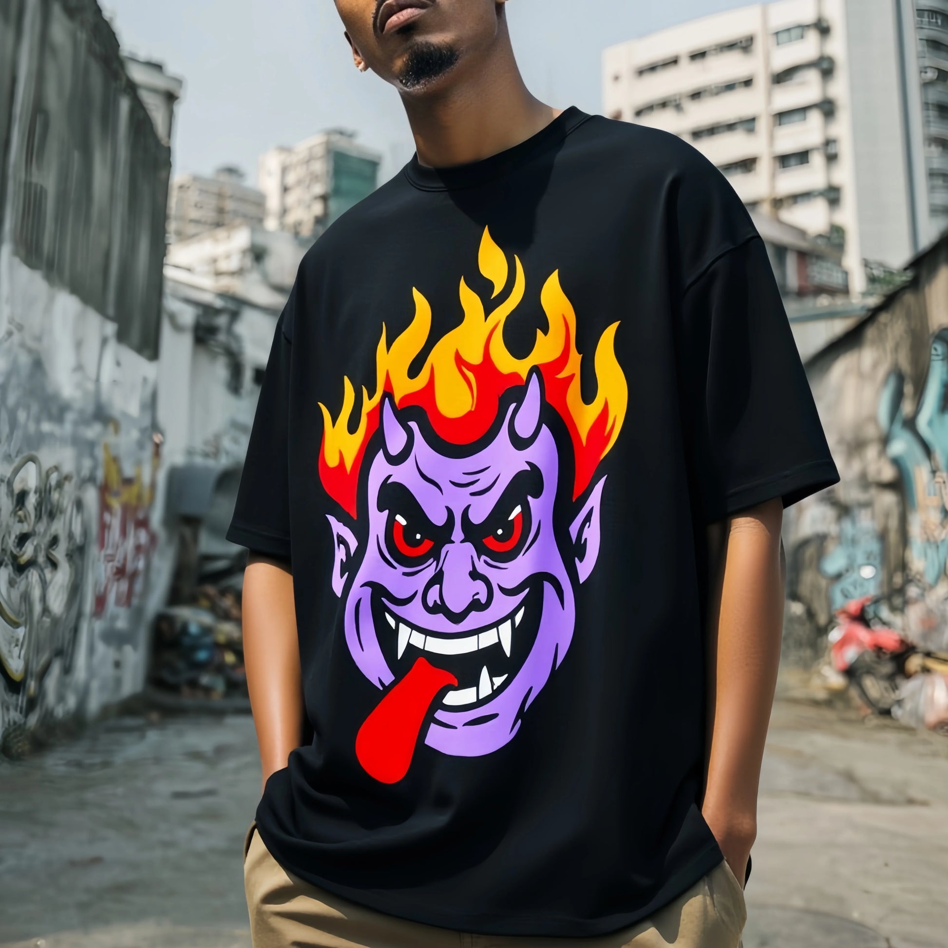 Men's Casual T Shirt with Fiery Devil Face Print for Streetwear Cotton Graphic Tee For Summer