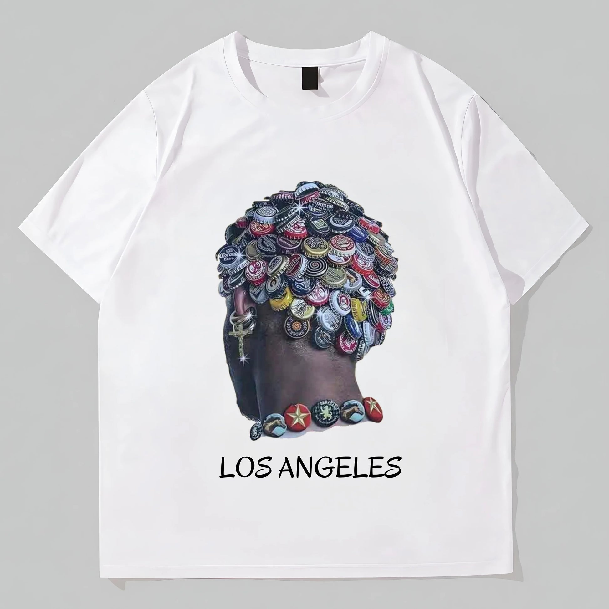 Men's Short Sleeve T-Shirt with Colorful Button Art and LOS ANGELES Text for Casual Wear Graphic Fashion Tees For Man