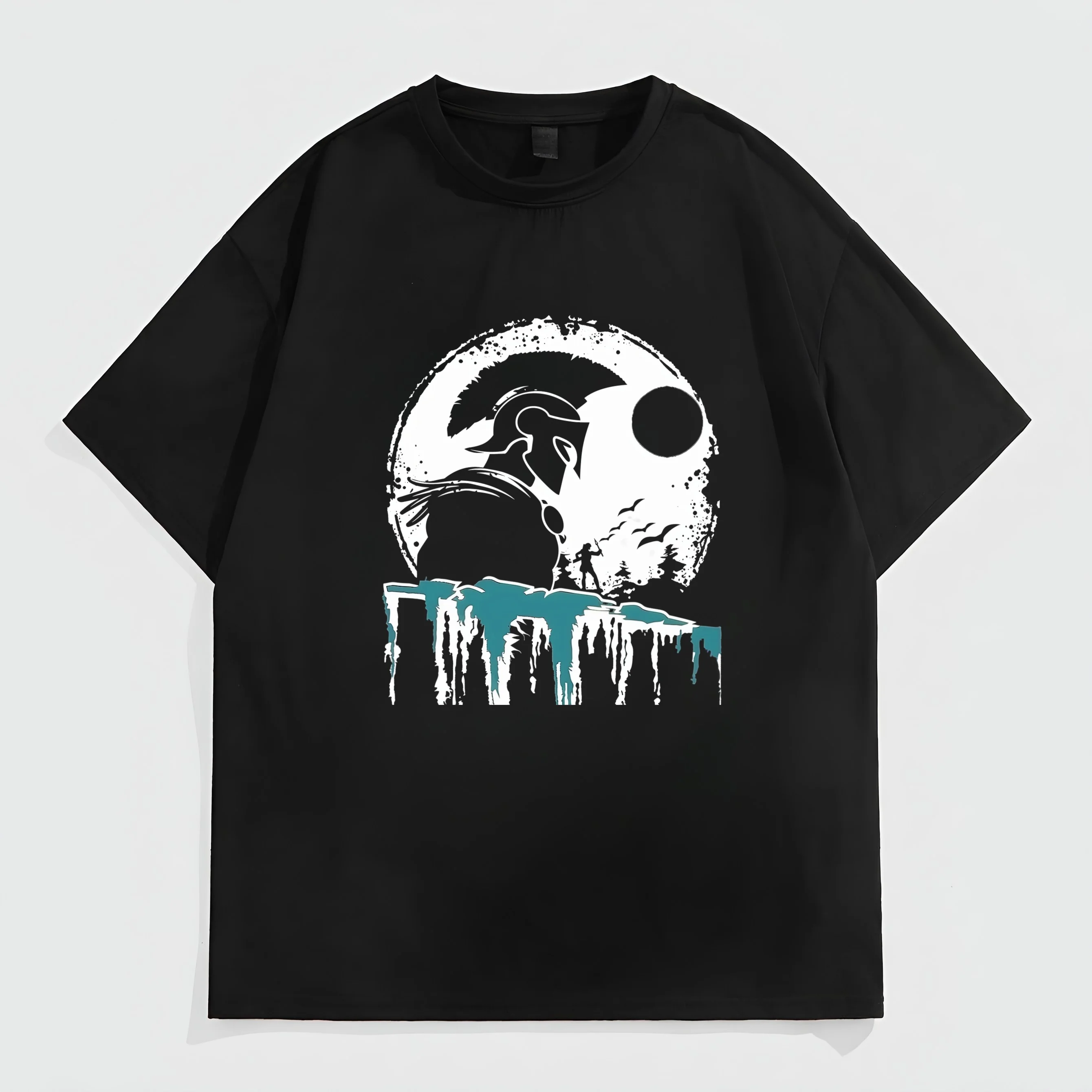 Trendy T-Shirt For Man Black Short Sleeve T-Shirt with Abstract Skull and Moon Print for Casual Wear