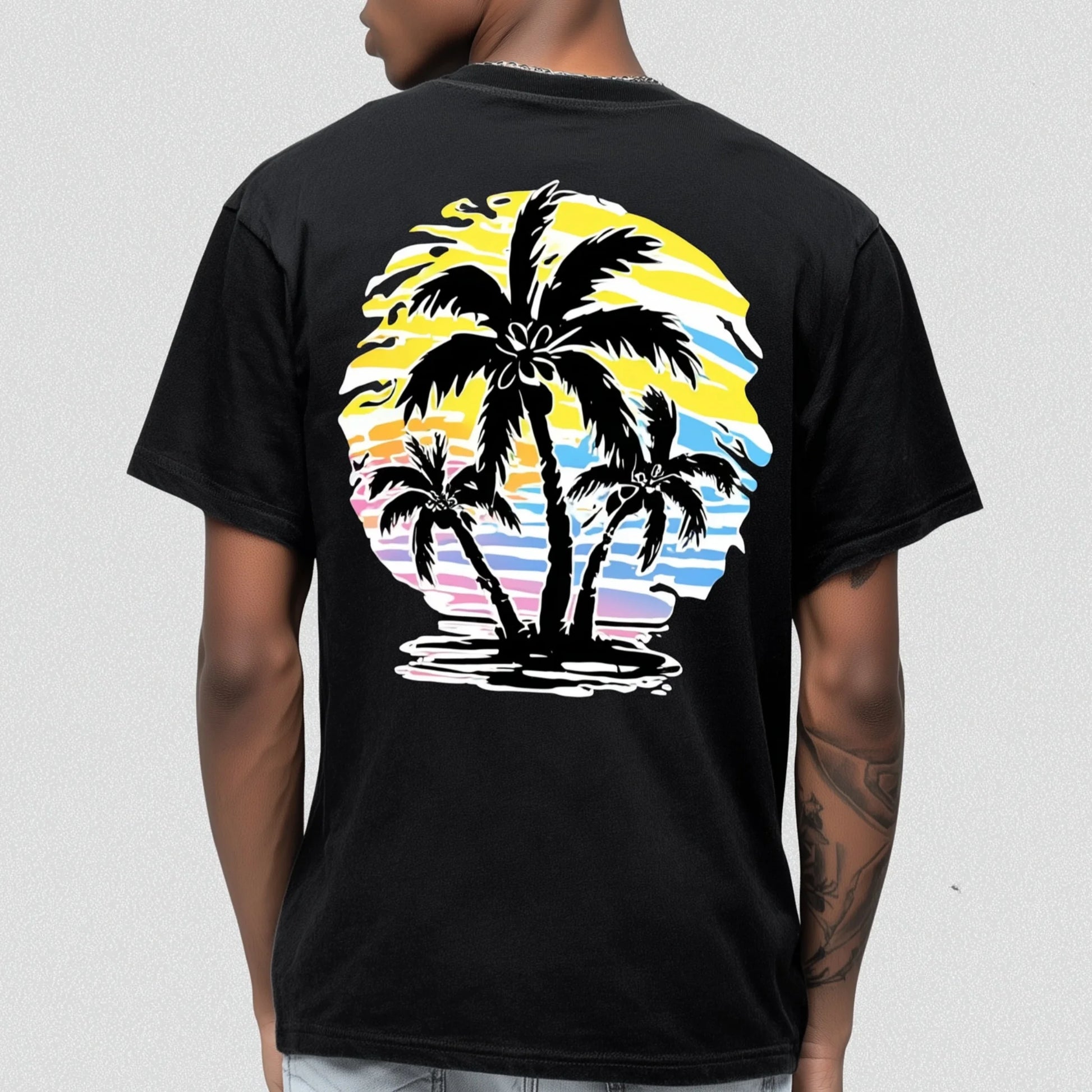 Trendy T-shirt For Man Black Short Sleeve T-Shirt with Palm Tree Sunset Print for Casual Wear