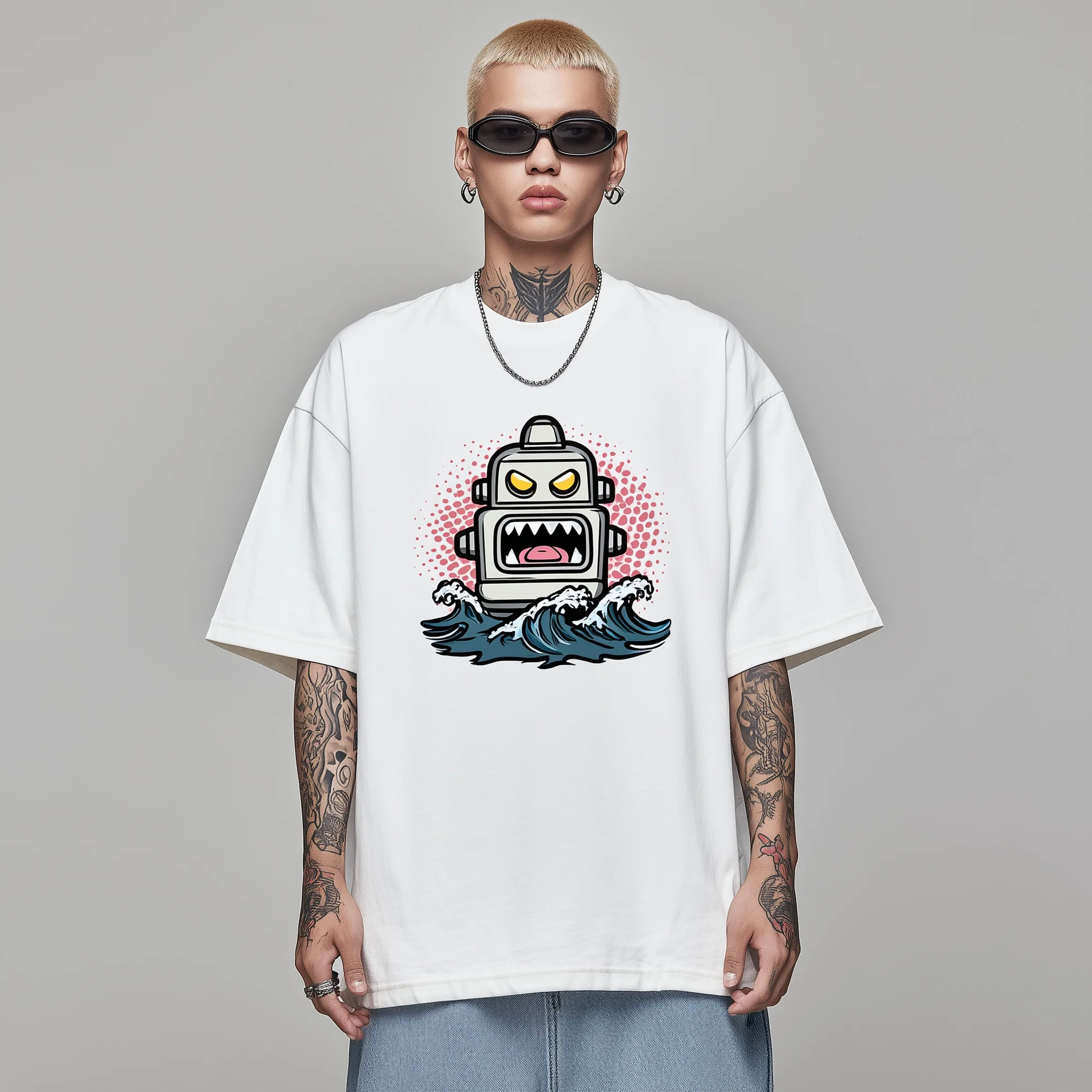 Trendy Tees For Man Oversized T-Shirt Cartoon Robot Wave Print Casual Streetwear Daily Wear