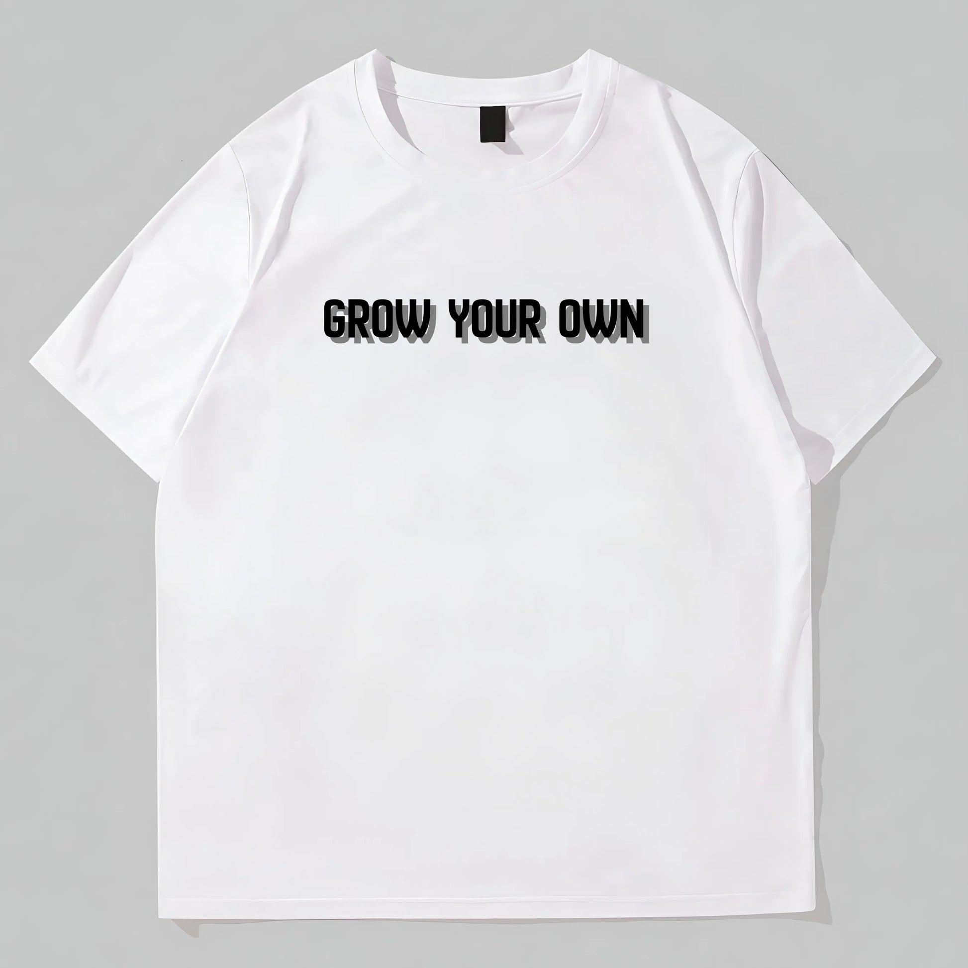 White Round Neck Short Sleeve T-Shirt with GROW YOUR OWN Text Print for Casual Wear Graphic Tees Design