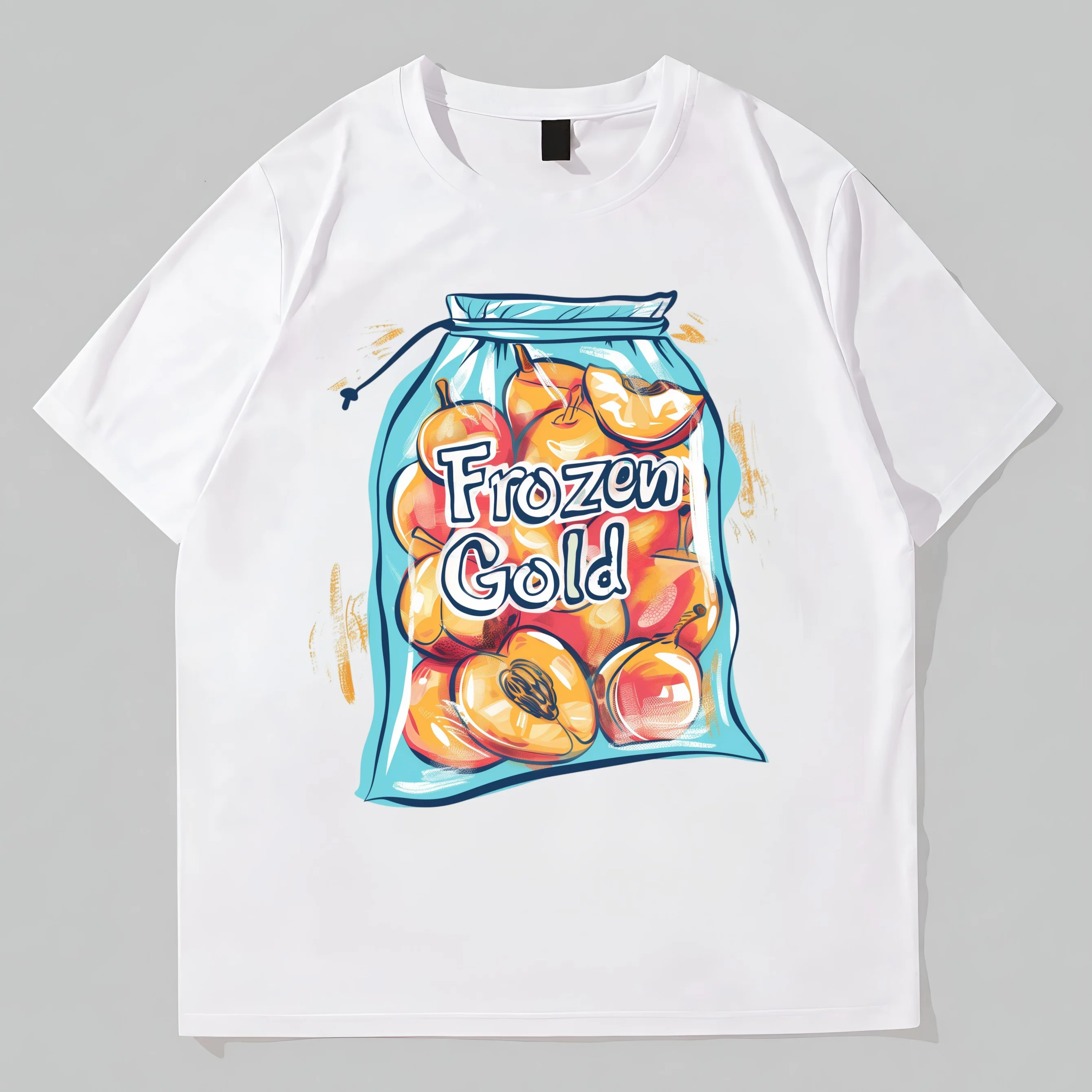White Round Neck T-Shirt with Frozen Gold Peach Bag Print for Casual Wear POD Graphic Tees