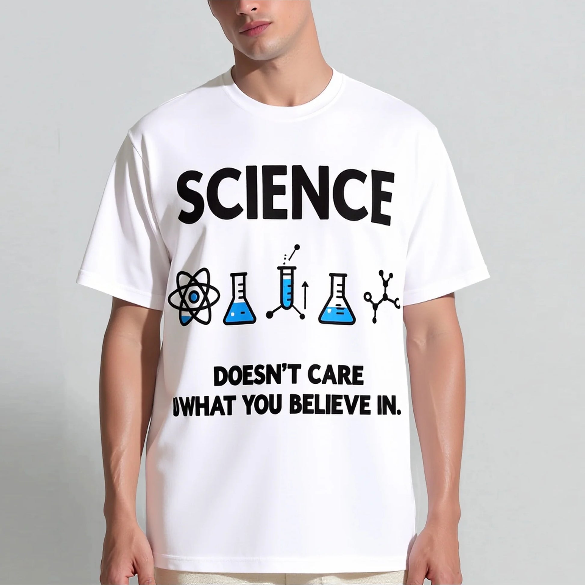 White T-Shirt with Science Symbols and Text Science Doesn't Care What You Believe In for Casual Wear Graphic Tees Boutique